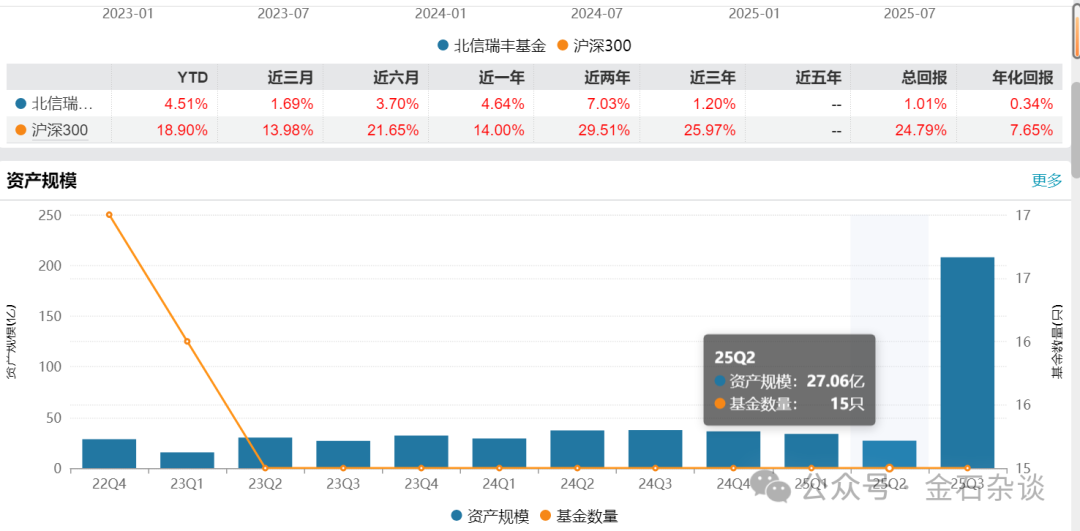 本来,该公募规模常年规模30亿上下打转,但就在2025年Q3该公募规模来到了207.9亿,而上季度的2025年Q2规模还停留在27.06亿,一个季度规模暴增6.68倍。