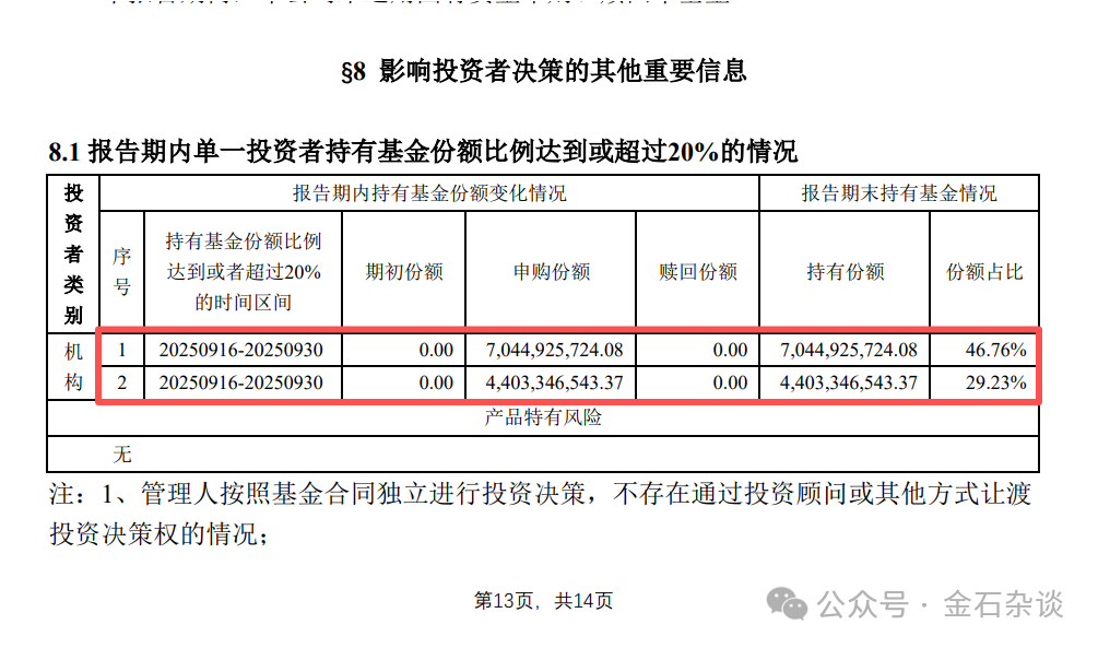 金石杂谈查询发现,规模之所以陡增,主要是Q2至Q3期间,有两家机构大幅买入,机构1买入70.45亿份(80亿元),机构2买入44亿份(50亿元)。而且本季度,资金共计买入150多亿份,由于只公布持仓比例超20%的机构,大概率除了这两家机构还有其他机构。